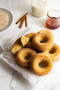 - While the donuts bake, stir the remaining ⅓ cup granulated sugar and 1 teaspoon cinnamon together in a small bowl. In a separate small bowl, melt the remaining 3 tablespoons butter in the microwave and stir in 1 tablespoon maple syrup. Let the doughnuts cool for 5 minutes after baking, remove them from the pans, and brush with the melted butter/maple syrup mixture and dredge them in the cinnamon sugar while they are still warm. Set aside to let rest for up to 5 minutes and enjoy!