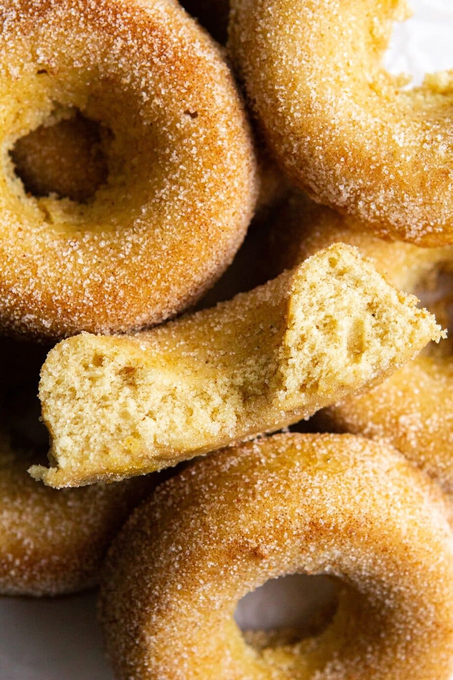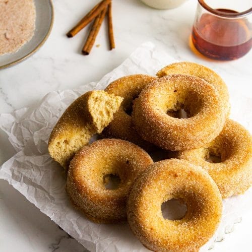 These soft apple cider cake donuts are baked to golden perfection, brushed with melted maple butter and coated with cinnamon sugar.