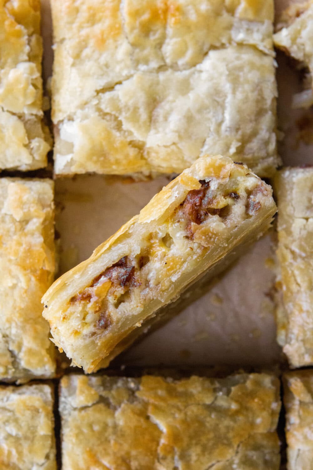 - Carefully place the second puff pastry sheet on top and press the edges to connect the top and bottom pastry sheets. Press them together with a fork all the way around. Brush egg wash all over the top and bake for 18-23 minutes or until golden brown. Let cool for 5-10 minutes before cutting into 9 pieces, or smaller. Serve while still hot/warm for ultimate flakiness.