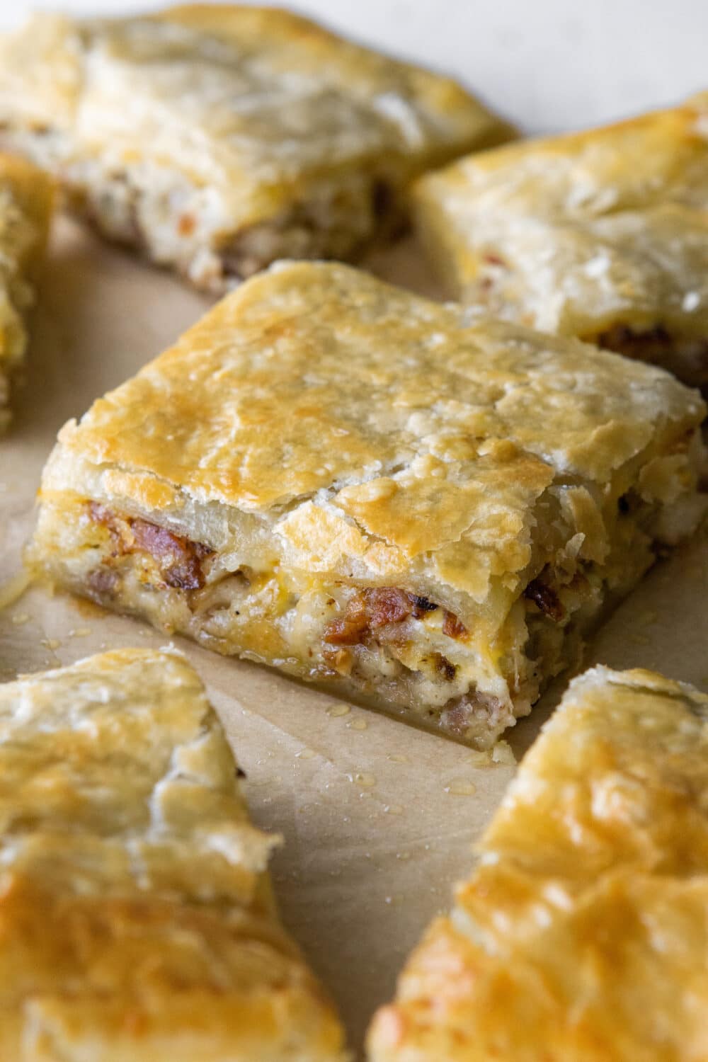 It starts off with breakfast sausage in a creamy white gravy, crispy hash browns, egg wash, havarti cheese slices, bacon, and MORE cheese layered onto a puff pastry sheet and then topped with the second puff pastry sheet. To finish it all off, bake until golden brown and flaky!