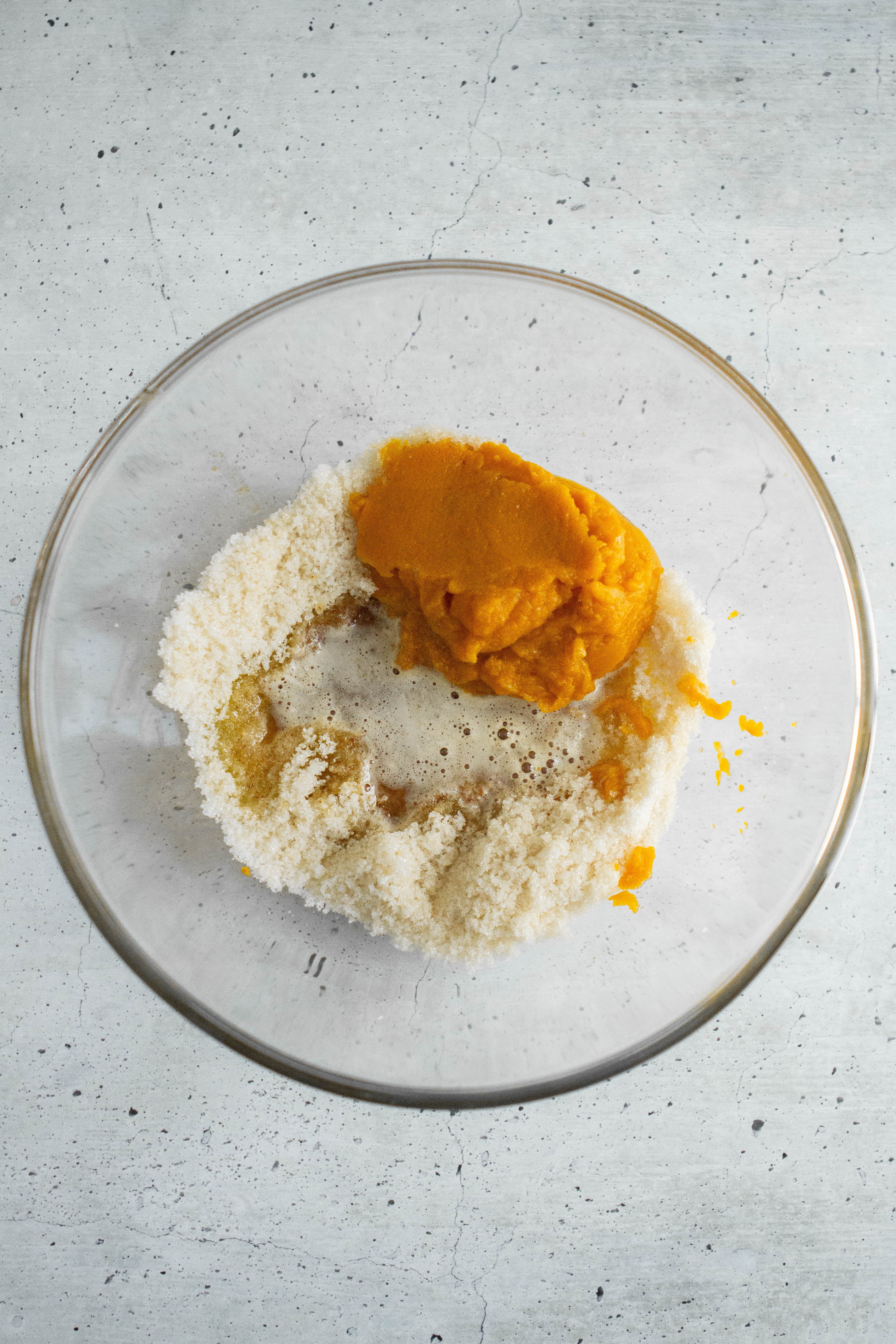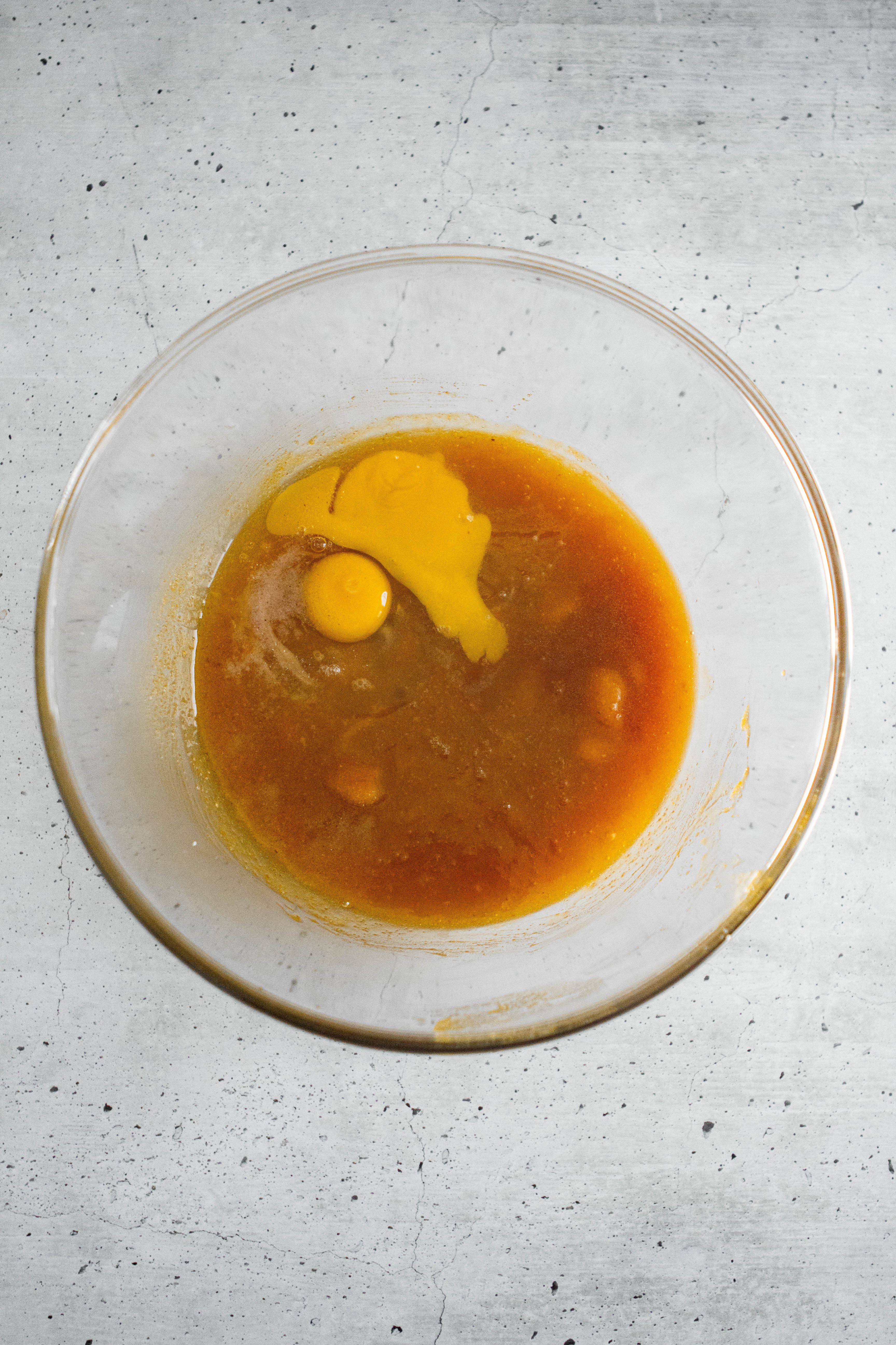 - In a large bowl, whisk together ½ cup browned butter, ½ cup pumpkin purée, 1 ½ cup brown sugar, 2 eggs, and 2 tsp vanilla until smooth.