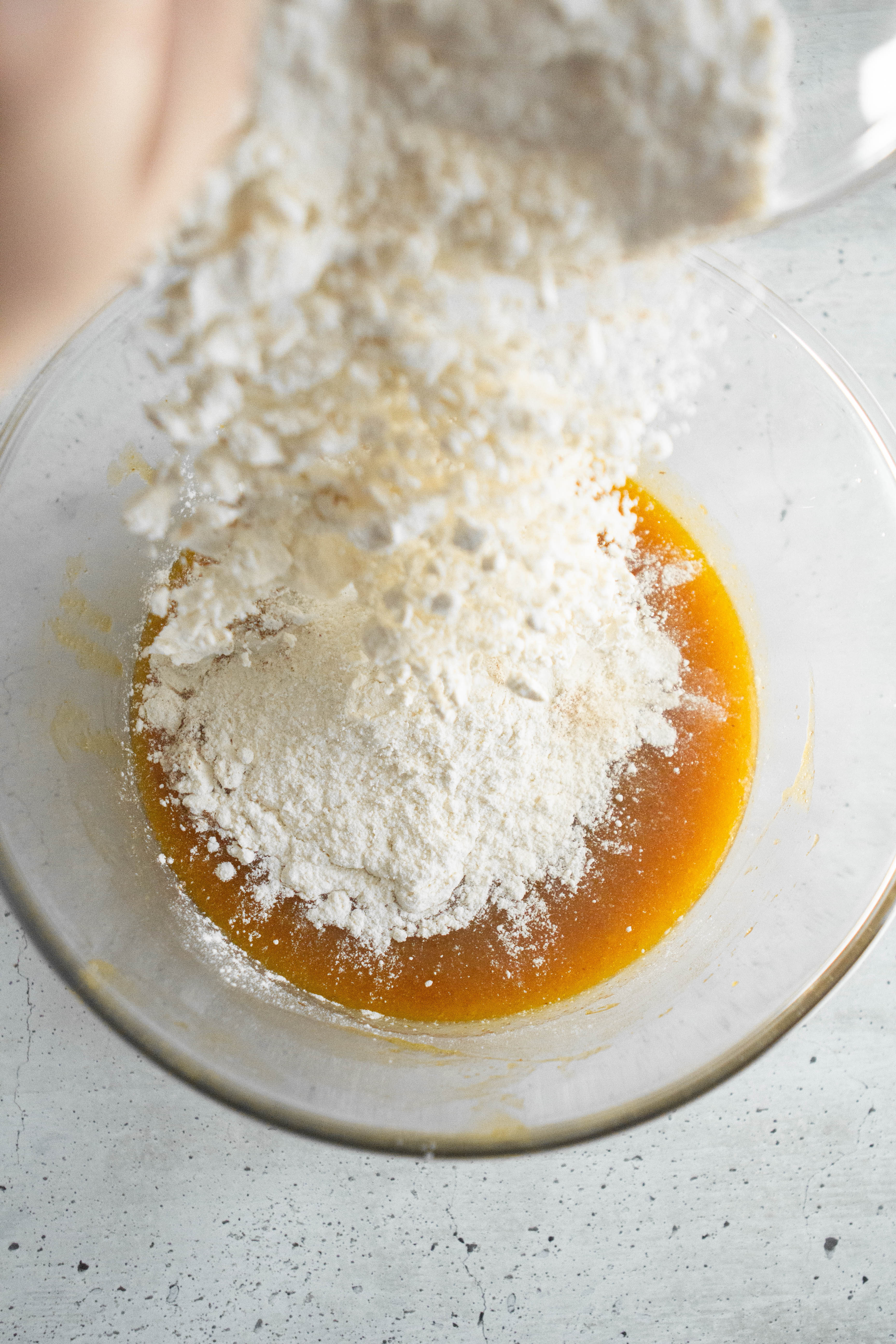 - In a separate bowl, whisk 2 ⅔ cup flour, 1 tbsp pumpkin pie spice, 1 tsp baking powder, 1 tsp baking soda, and 1 tsp salt.