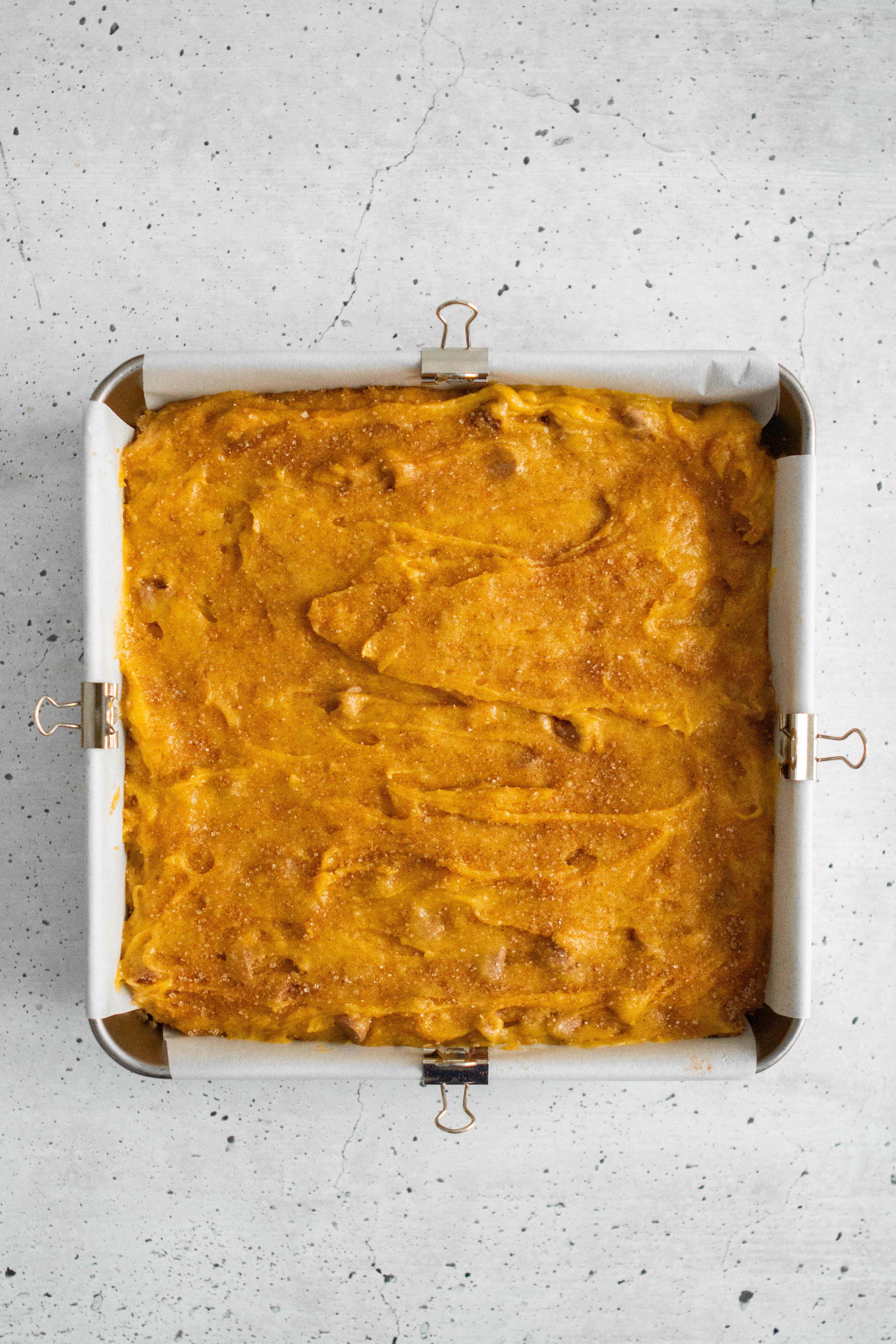 - Preheat oven to 350°F. Line an 8×8 or 9×13 pan with parchment.