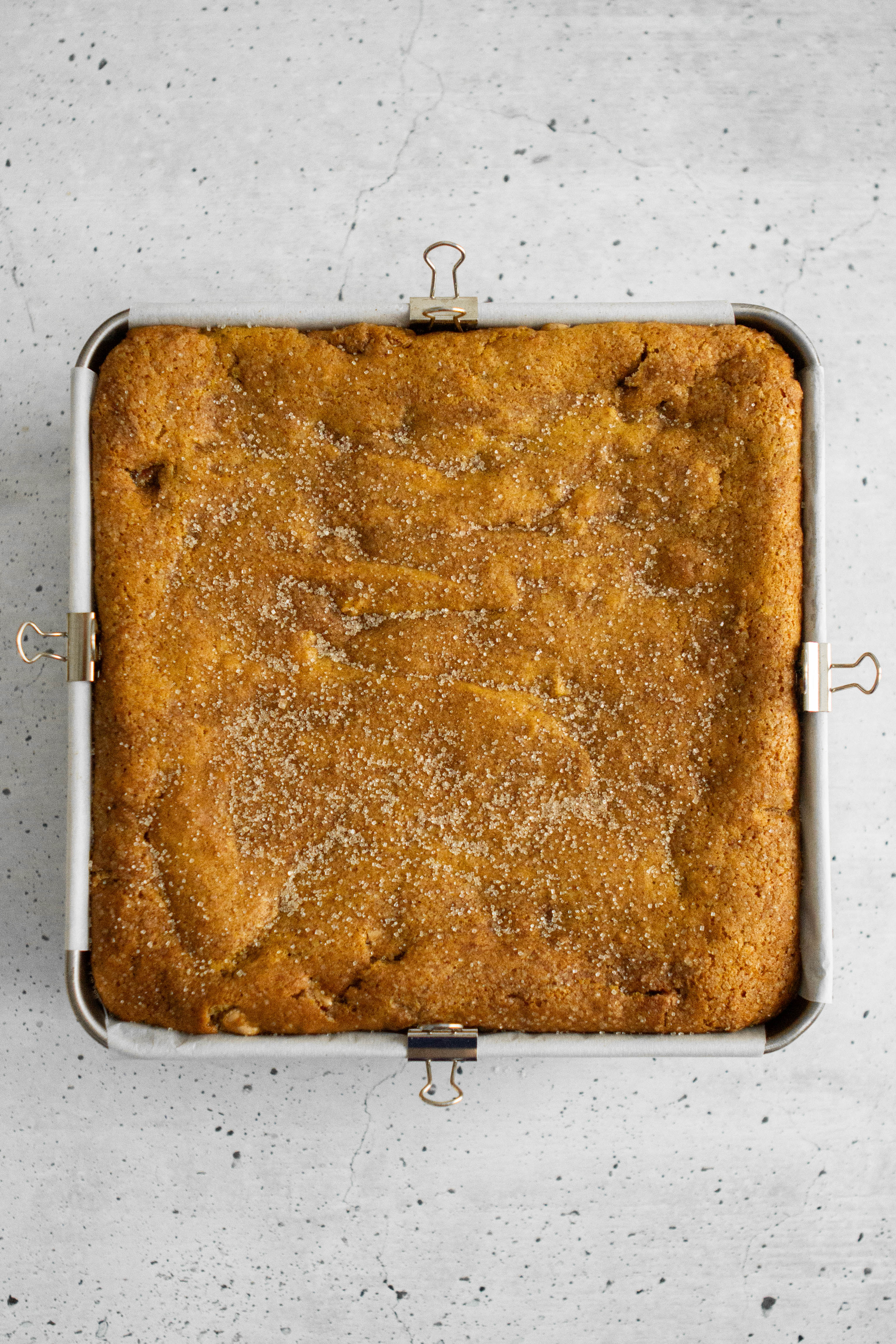 Preheat oven to 350°F. Line an 8×8 or 9×13 pan with parchment. Spread batter evenly in the prepared pan. (If using an 8×8 pan, it will result in a thicker blondie which will take longer to bake- about 30-38 minutes. If using a 9×13 pan, it will be thinner and will take less time- 20–28 min)