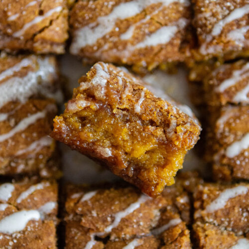 These pumpkin blondies are soft, chewy, and rich with brown butter flavor. Finished off with sweet maple glaze drizzled on top.