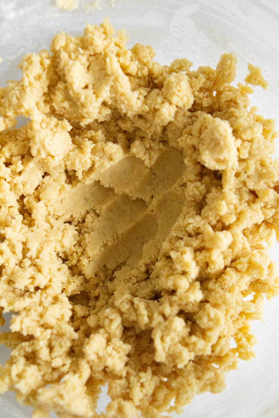 Mix in the flour and salt until you see no more flour- but there are large wet-looking crumbs. You can tell it’s the perfect consistency when your fingers leave an imprint and it comes together perfectly