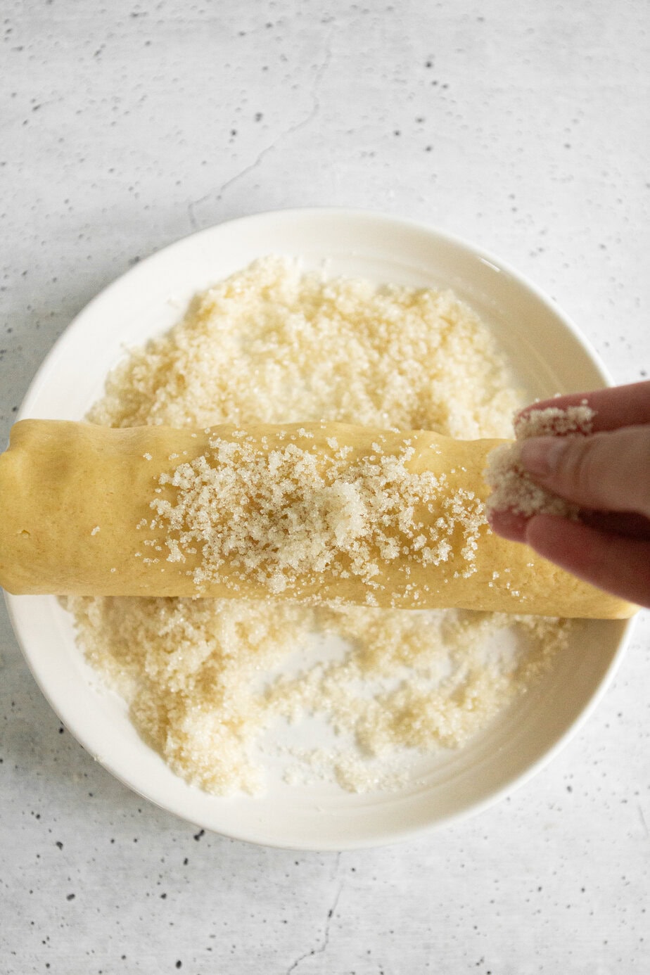 Roll the dough into a log with flat ends on either side. I aim to make the log about 7-8in long. Roll the log of dough in maple infused coarse sugar (Put about a tsp of maple syrup on a plate or flat surface and add sugar until not clumpy, but slightly wet) Immediately roll the dough into a plastic/cling wrap and refrigerate for 30 minutes.