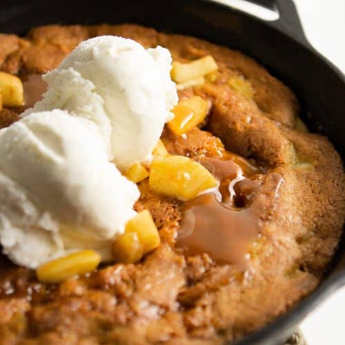 - Bake for about 15-20 minutes or until the cookie is golden brown and little-to-no jiggling. Let cool for about 5-10 minutes. Top with remaining 10% cubed apples, vanilla ice cream, and remaining caramel sauce