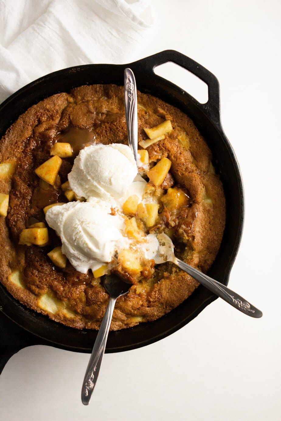 This hot, buttery, ooey-gooey, caramel-apple skillet cookie is EXACTLY what I want on a chilly, fall night. It’s so easy to throw together, there’s no cookie-scooping required, and you don’t need a bowl! 🙂