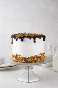 - Add some crushed up butterfinger or reeses cups around the base of the cake and on top if desired. I added a fudgy ganache drip around the cake (tutorial coming for that!)