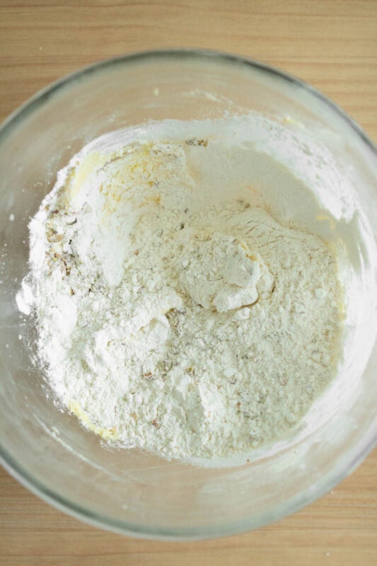 Add the flour and salt and mix just until the dry spots disappear. The dough won’t be smooth; it will look crumbly with big clumps. That’s perfect. Fold in the chopped pistachios with a spatula or your hands.