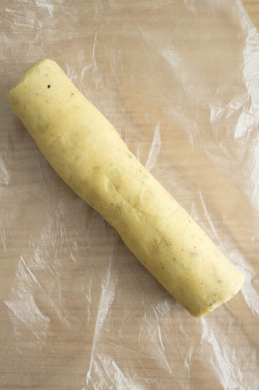 Chop pistachios finely for a smoother dough– Large pistachio pieces can tear the dough or create cracks when slicing the log. Use a sharp knife to chop them into small pieces so they distribute evenly throughout the dough without causing breaks or uneven slices.