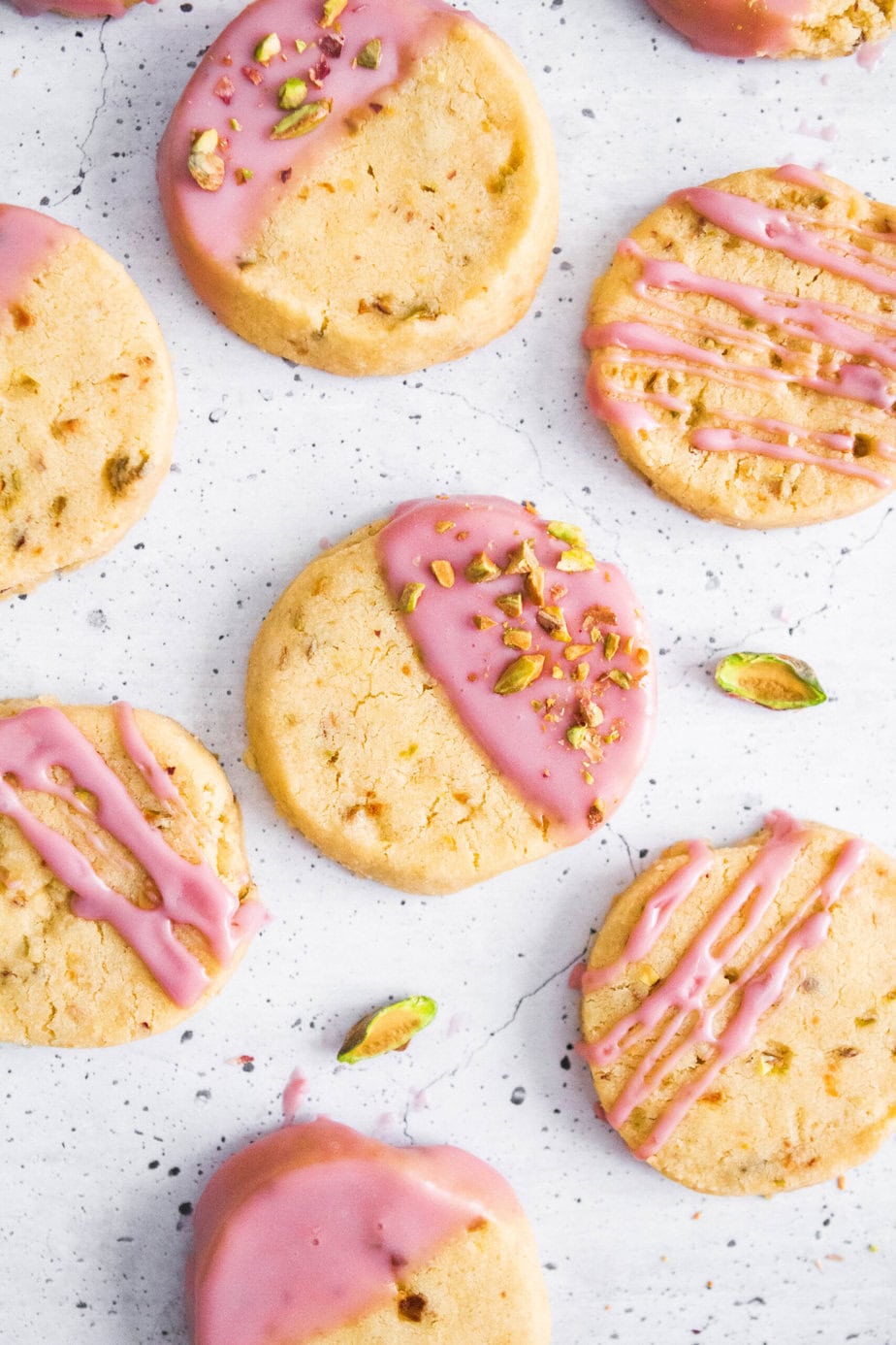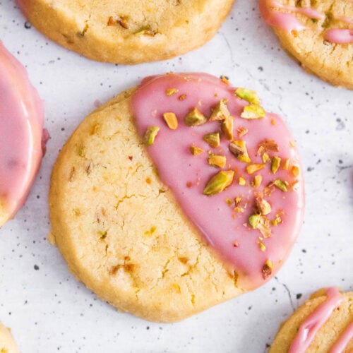 A rich, buttery, shortbread cookie with chopped pistachios and a pomegranate glaze on top.