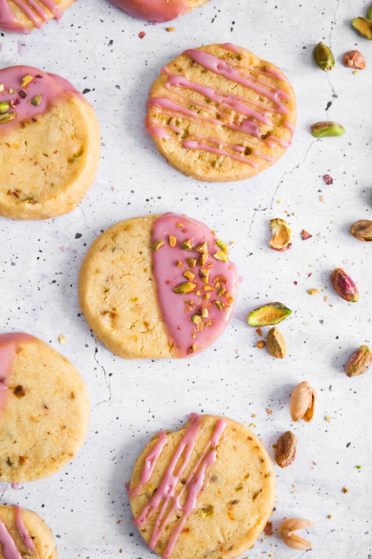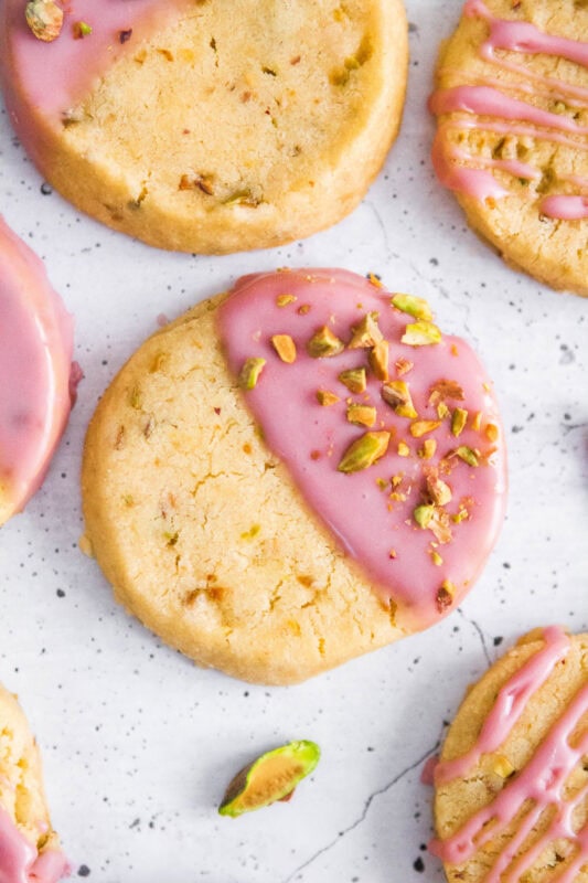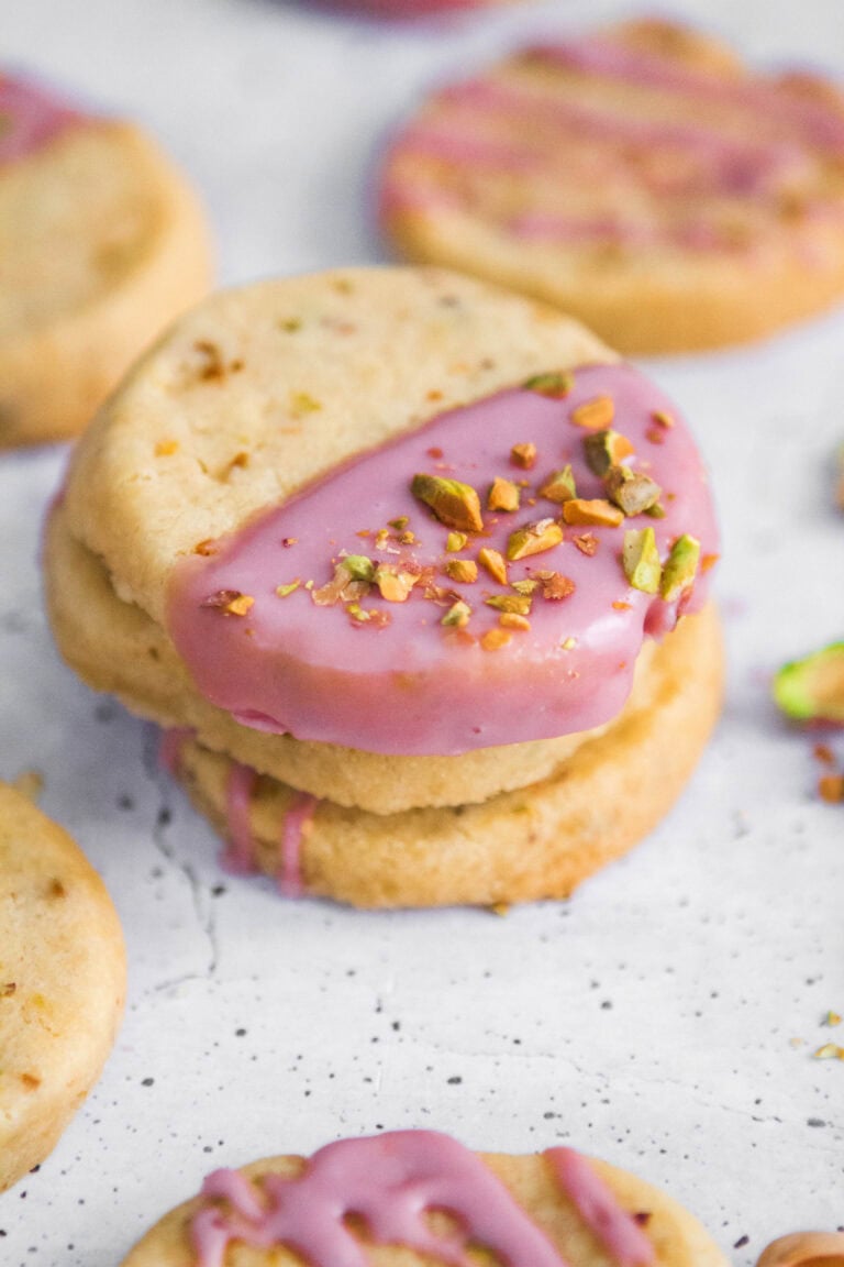 Okay, I’ll say it. Shortbread cookies are the superior cookie. They’re so versatile for both sweet and savory flavors, they’re easy to make, they have minimal ingredients, shall I go on? This flavor combo was out of my comfort zone because I am a picky eater and I’ve never really had pistachios but there’s been a huge uptick in pistachio flavored things recently. I gave it a try in my favorite cookie and now, you’d have a real hard time trying to pry pistachios out of my hands LOL!