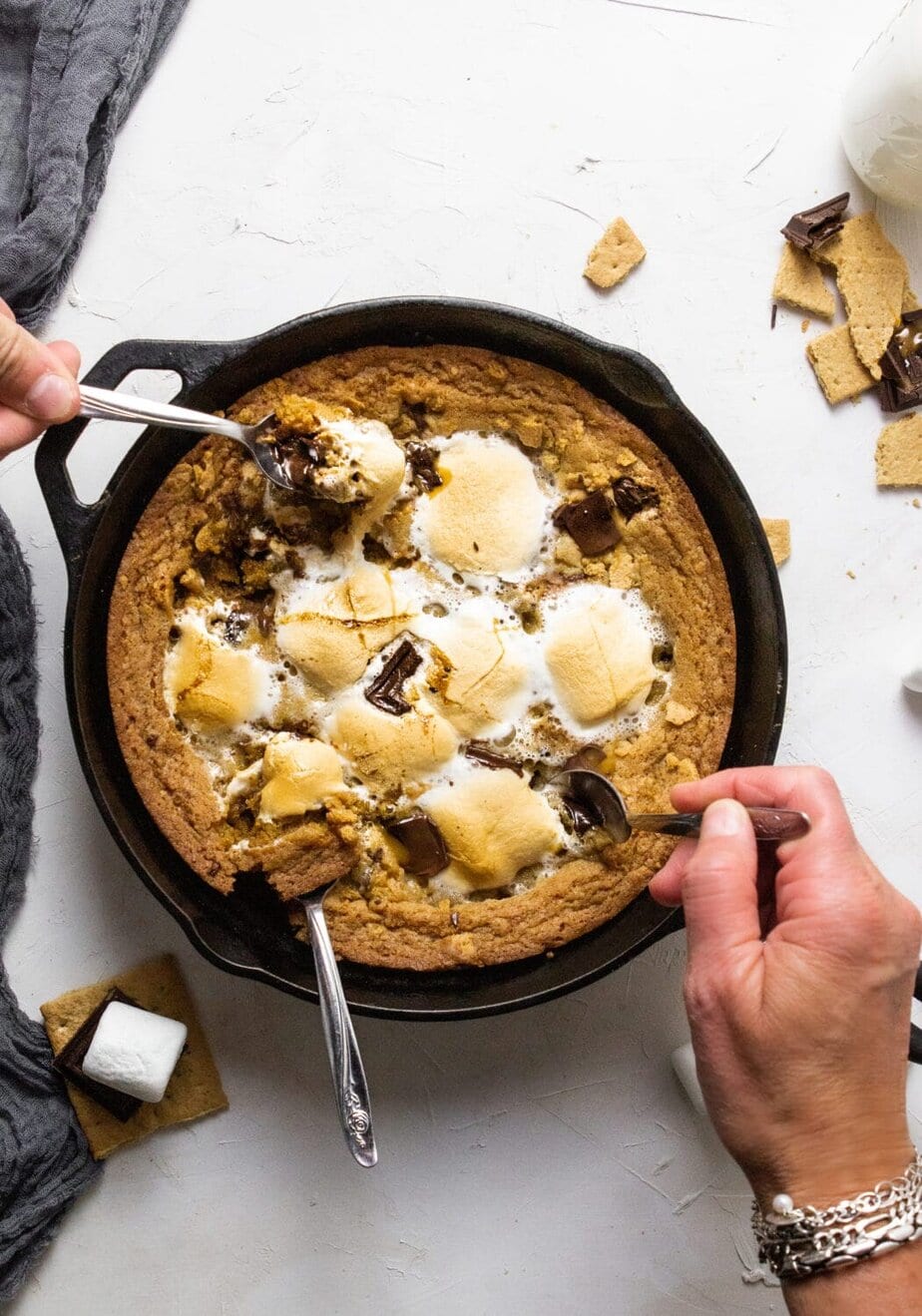 grab a roll of chocolate chip cookie dough at your local grocery store and use it instead of making the cookie dough. press the pre-made cookie dough into the cast iron pan and press the graham cracker pieces into the dough so that they don’t sit directly on top. Top with marshmallows and chocolate bar pieces and bake for 10-15 minutes or until golden brown and the marshmallows are toasted. If the the marshmallows are toasted but the cookie is still jiggly underneath, it will still be cooking after it has been taken out of the oven so it should stiffen up after 10-15 minutes of cooling time.