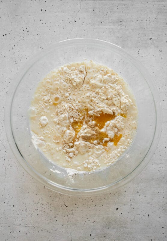 - In a small separate bowl combine the water, milk, sugar (or honey or agave) and melted butter. Add to the flour yeast mixture.