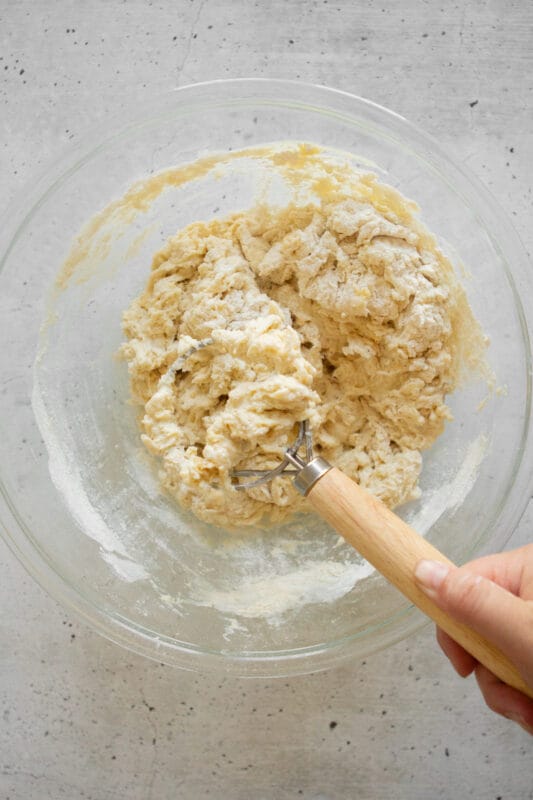 Using a spatula, stir until you have a sticky, shaggy dough ball.