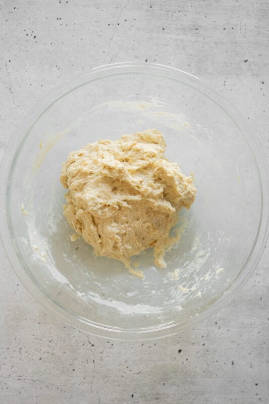 - Using a spatula, stir until you have a sticky, shaggy dough ball. It will feel sticky upon mixing. Cover the bowl and let the dough rest for at least 30 minutes or as long as an hour.