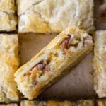 Carefully place the second puff pastry sheet on top and press the edges to connect the top and bottom pastry sheets. Press them together with a fork all the way around. Brush egg wash all over the top and bake for 18-23 minutes or until golden brown. Let cool for 5-10 minutes before cutting into 9 pieces, or smaller. Serve while still hot/warm for ultimate flakiness.