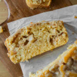 Pour half of the cake batter into the loaf pan and then sprinkle the apples on top. Cover the apples with the remaining cake batter.