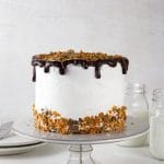 Add some crushed up butterfinger or reeses cups around the base of the cake and on top if desired. I added a fudgy ganache drip around the cake (tutorial coming for that!)