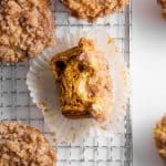 Moist pumpkin muffins with a rich cream cheese swirl and topped with a buttery streusel