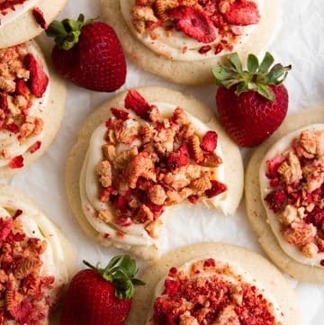 To make the toping: Mix the freeze-dried srawberries and golden oreos in a food processor (or using a rolling pin and a ziploc bag) until they are medium-large crumbs.